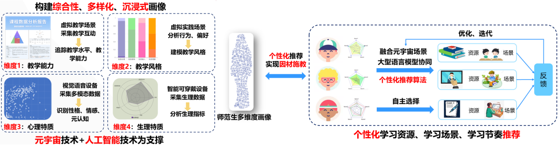 通过对交互过程中的多模态数据采集与分析,形成师范生的教学能力、教学风格、心理特质和生理特质综合画像,实现师范生实践教学能力培养的学习节奏、学习资源和学习场景个性化推荐,驱动实施更加高阶的教学实践。