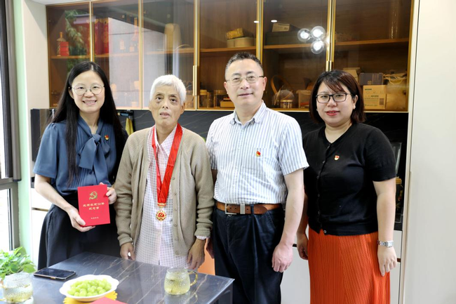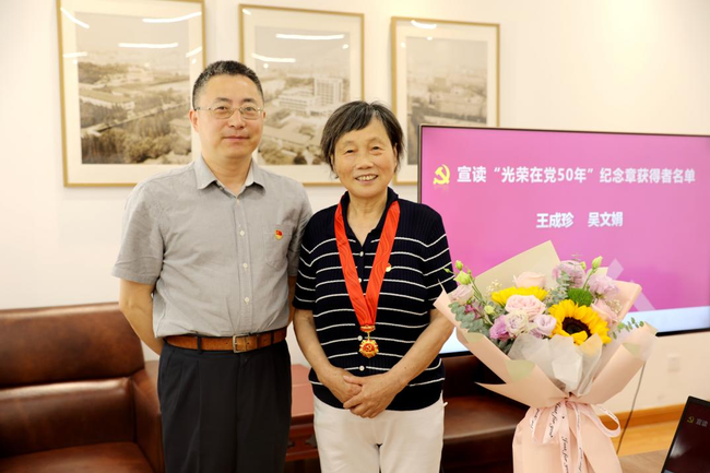 公司党委书记余佳首先宣读了“光荣在党50年”名单,公司退休教工党员吴文娟、王成珍两位老师荣获纪念章。考虑到两位老同志年事已高,公司党委已提前向两位老同志颁发纪念章。