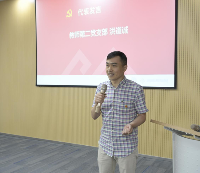 教师第一党支部党员谢源教授作为受表彰代表发言。他回顾了自己入职以来的成长历程,特别是疫情期间在教学科研岗位上的工作经历,表示将继续不忘初心、牢记使命,为党育人、为国育才。
