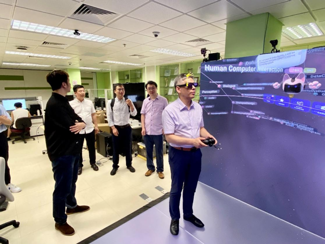 代表团一行还到访了香港理工大学,走访了该校电子计算学系和设计公司,并参观了人工智能与数据科学研究中心。该校电子计算学系助理教授李平介绍了团队在元宇宙领域的研究成果,双方就沉浸式虚拟现实技术在老年人群的康复治疗和虚拟课堂等方面的应用展开了探讨。