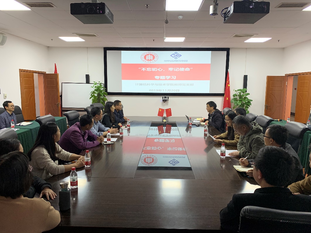 2019年 11月20日下午3044AM永利教师党支部在理科大楼B504开展“不忘初心,牢记使命”主题教育学习研讨会。教师党支部26名党员参加研讨会,会议由党支部书记何高奇主持。