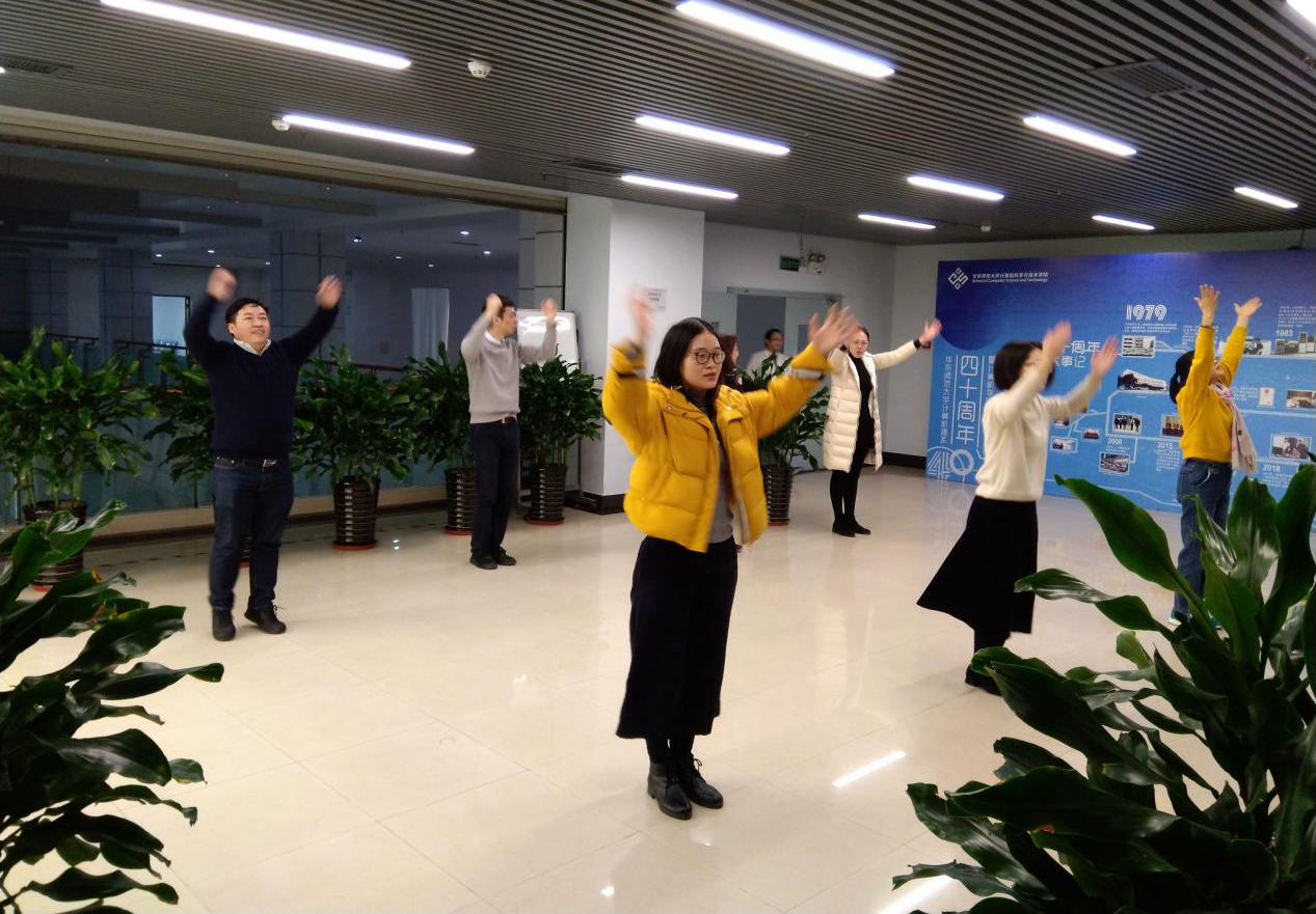 2020年元旦假期回来的第一天,公司老师们积极响应公司工会的号召,相聚的理科大楼5楼的公共平台,开展工间操团建活动。经过为期近半年的训练,公司工会不断在“持续”上下功夫,部分老师已经养成做广播体操、工间操的良好习惯。公司工间操队伍不断壮大,现已形成比较稳固的一支队伍。