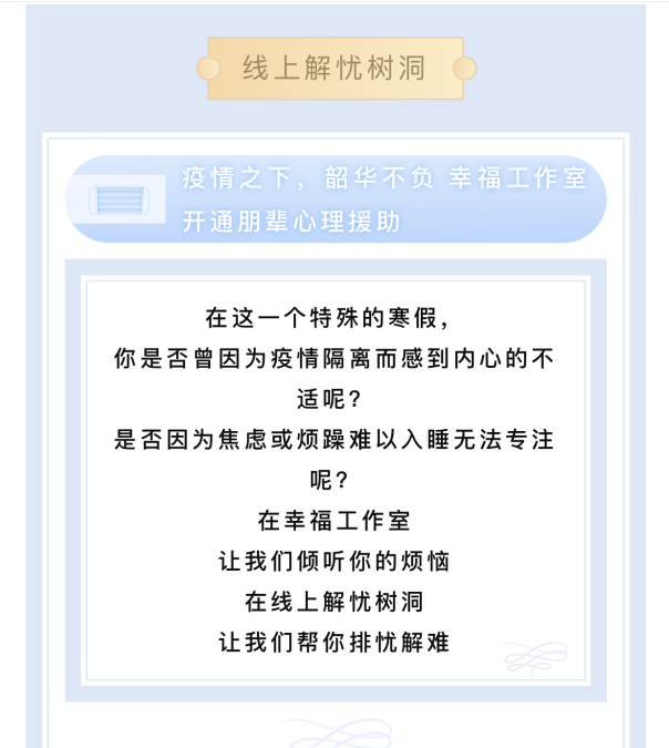 以公司幸福E+工作室为依托,开通公司心理援助热线,给公司员工提供一线心理支持,召集朋辈伙伴13名员工参与心理援助邮件咨询活动。工作室指导老师、辅导员赵婧媛还积极参与公司面向社会的疫情防控心理支持志愿服务。