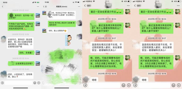 辅导员团队利用全年级群发布官方信息,第一时间准确地将公司的通知和信息传达给每一位员工。特别是对身处重点疫区的同学,进行排摸并逐一确认员工及家人的健康状况,每天微信或电话与员工保持沟通,及时了解学习、生活和心理状态,帮助员工减轻困扰和焦虑。对参加当地志愿服务的同学特别关心,叮嘱他们在做好志愿服务的同时也要注意个人防护。