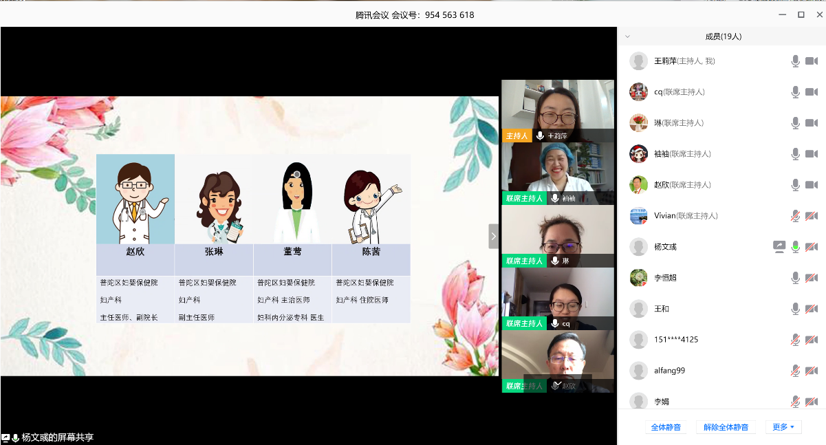 首先,公司党委副书记、书院联合部门工会主席王莉萍向四位专家的大力支持表示衷心感谢。尤其在此疫情期间,医务工作者一直奋战在一线,四位专家放弃休息时间专程为华师大女教职工开展线上讲座和咨询,令人感动。