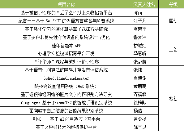 根据项目组汇报与答辩情况、项目的总体完成情况、项目的创新性以及文档的规范性等,拟推荐国创3组,上创4组,校创8组,最后以教务处的公布结果为准。具体公示如下: