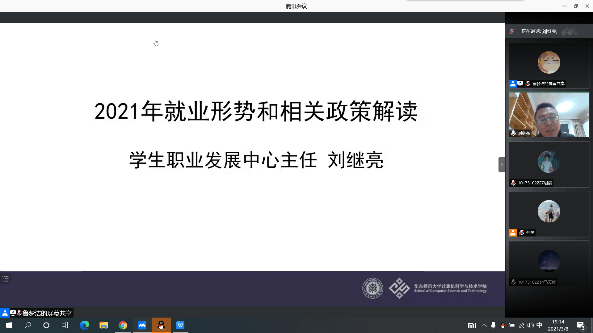 员工职业发展中心主任刘继亮对2021年的就业形势和相关政策进行解读。刘老师指出,应届毕业生要做到积极就业、及时就业和规划就业。同学们要及时调研和了解最新就业形式,适时调整就业预期,同时也要关注公司公司组织举办的就业招聘活动。