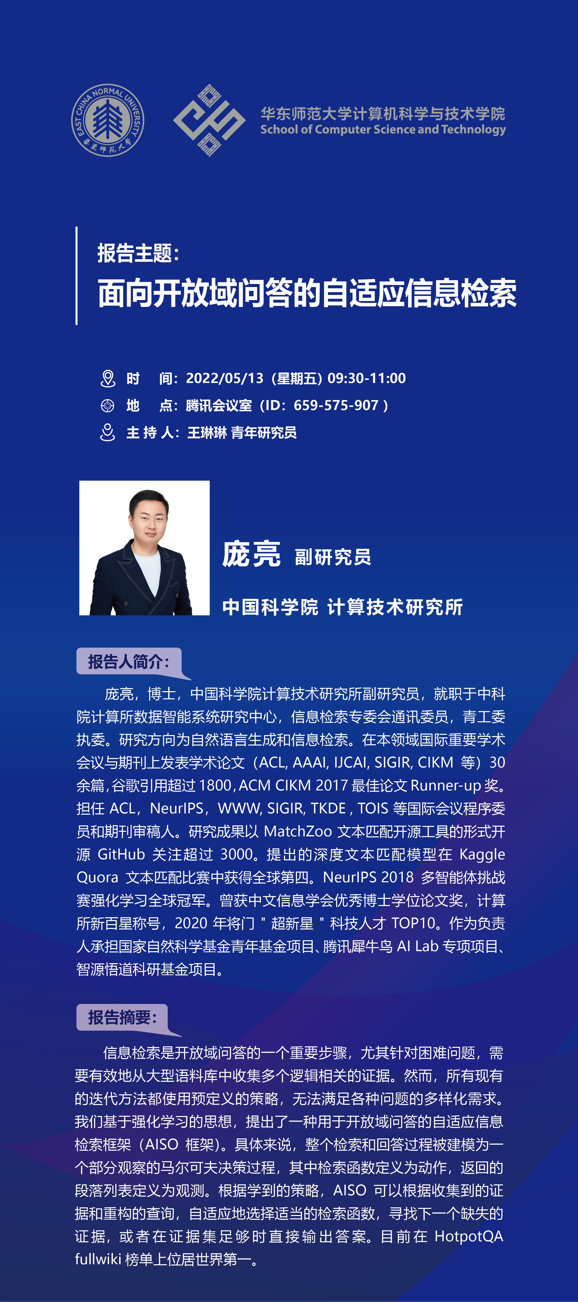 庞亮,博士,中国科公司计算技术研究所副研究员,就职于中科院计算所数据智能系统研究中心,信息检索专委会通讯委员,青工委执委。研究方向为自然语言生成和信息检索。在本领域国际重要学术会议与期刊上发表学术论文(ACL, AAAI, IJCAI, SIGIR, CIKM等)30余篇,谷歌引用超过1800,ACM CIKM 2017最佳论文Runner-up奖。担任ACL,NeurIPS,WWW, SIGIR, TKDE , TOIS等国际会议程序委员和期刊审稿人。研究成果以MatchZoo文本匹配开源工具的形式开源GitHub关注超过3000。提出的深度文本匹配模型在Kaggle Quora文本匹配比赛中获得全球第四。NeurIPS 2018多智能体挑战赛强化学习全球冠军。曾获中文信息学会优秀博士学位论文奖,计算所新百星称号,2020年将门超新星科技人才TOP10。作为负责人承担国家自然科学基金青年基金项目、腾讯犀牛鸟AI Lab专项项目、智源悟道科研基金项目。