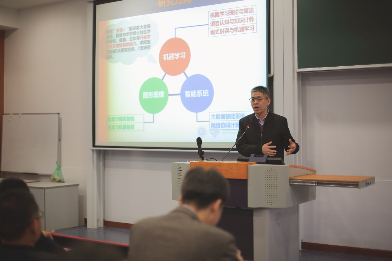 随后,公司主持工作副经理周爱民梳理了计算机学科42年来的发展脉络,介绍了公司3大研究方向,7支研究团队情况,同时,还例举了目前公司各科研团队在AI+教育、AI+健康、智慧政务、金融科技、智能系统等领域的项目成果。