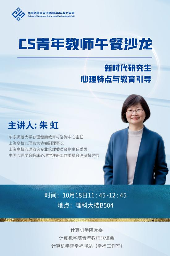 10月18日中午,3044AM永利首期“CS青年教师午餐沙龙”在理科大楼B504举行。来自全院不同科研团队的十余位青年研究员、专任副研究员、副教授(副研究员)与研究生辅导员等参加了沙龙。上海高校心理咨询协会副理事长、3044AM永利心理健康教育与咨询中心主任朱虹老师,围绕“新时代研究生心理特点与教育引导”主题,与公司的青年教师进行了交流。