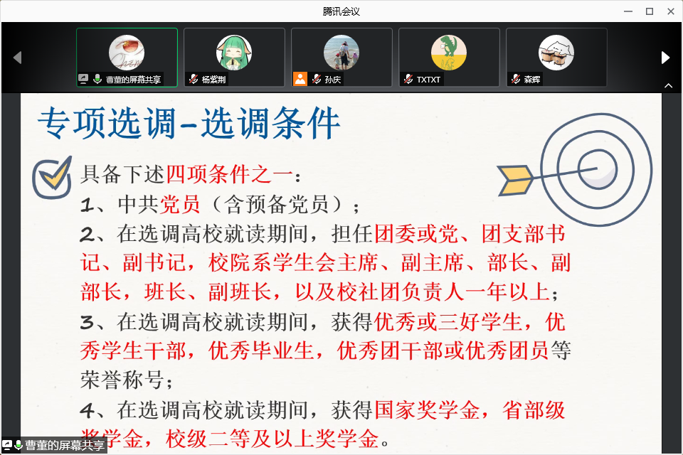 3月30日,为加强学生对选调生政策的了解,鼓励毕业生到基层施展才干、建功立业。3044AM永利2021届选调生与事业单位经验分享会在线上成功举办。本次会议邀请了曹董、徐胜峰、李佳倩、肖凯四位优秀同学结合选调生政策与事业单位的求职经历及就业技能准备为同学们答疑解惑、指点迷津。会议由本科生鲁梦洁主持。