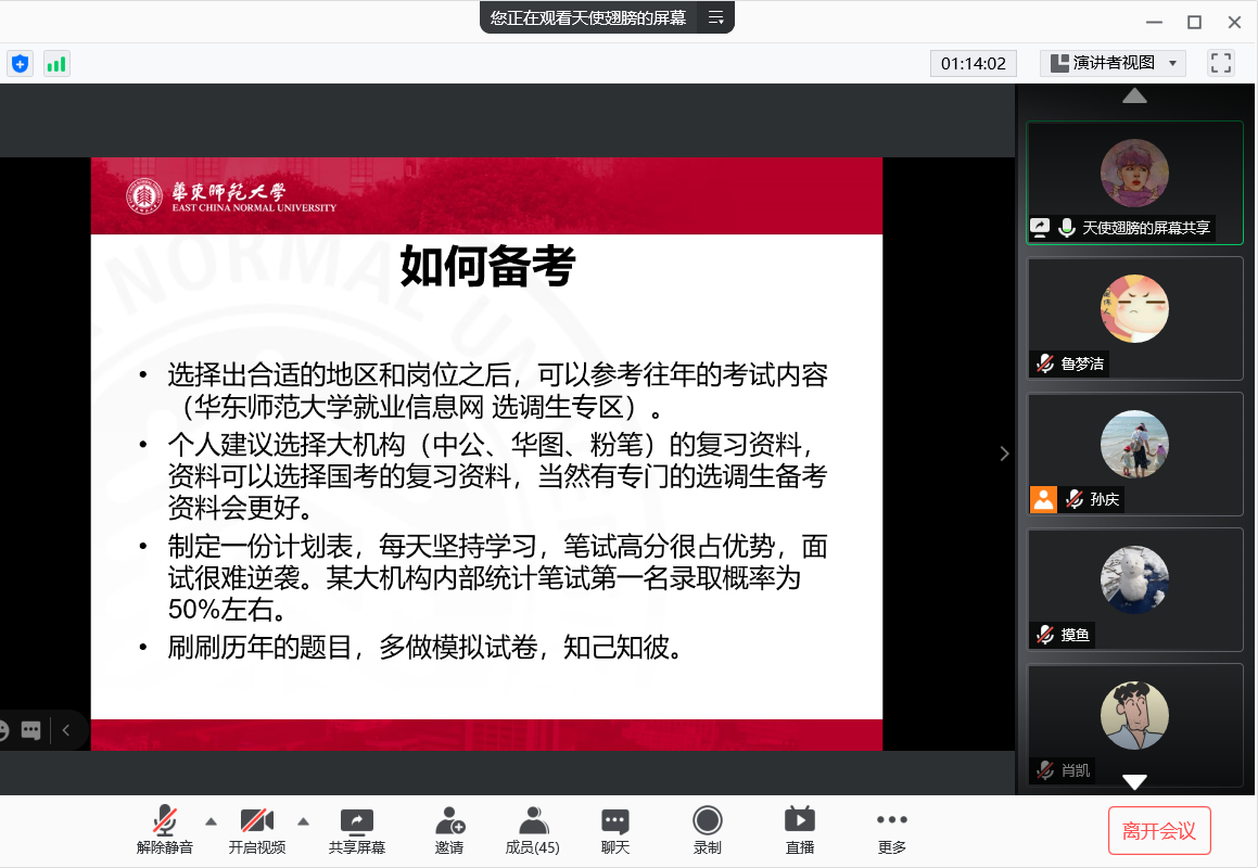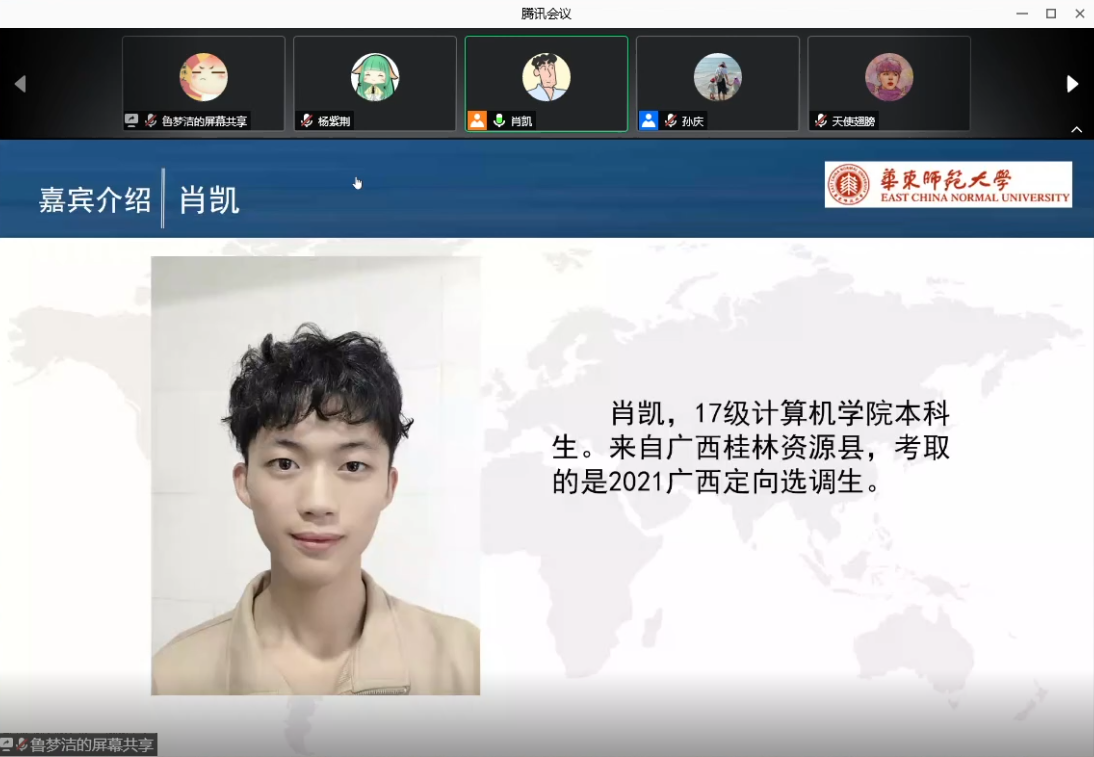 2018级计算机科学与技术系硕士李佳倩,目前任职上海市南洋模范中学,为大家分享了教师报考的经验。李佳倩同学提到,高中教师的招聘时间一般从9月底开始,截止到10月初。建议大家现在可以根据自身的条件,去报考专业对口的教团队格证,教师招聘的主要流程包括:笔试,面试,考编等;同时也鼓励其他有志于教师工作的同学尽早开始准备。