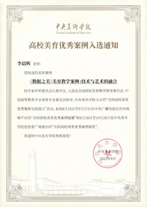 “《数据之美》美育教学案例:技术与艺术的融合”入选展览和展播案例,全国仅二十二例,案例在中央广播电视总台央视频平台展播。