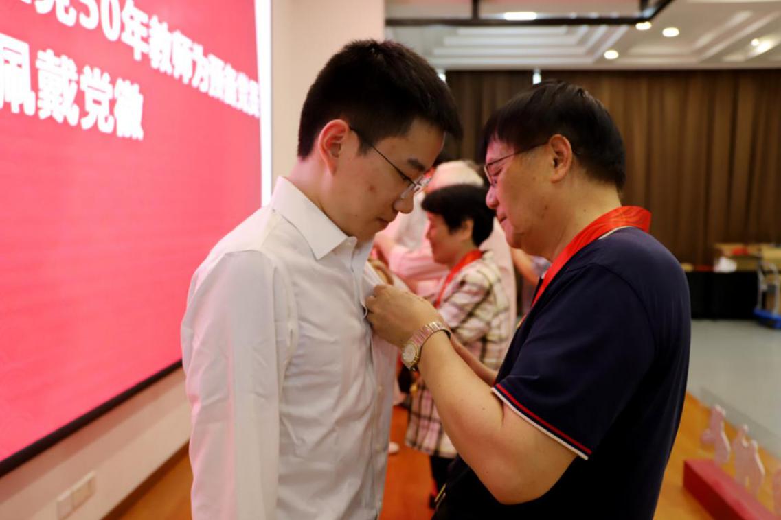 一代代计算机人的精神在党徽中传递、在誓言中传承,老党员们为新党员们佩戴党员徽章,在计算机系第三任系主任刘淦澄教授的带领下,新党员重温入党誓词。