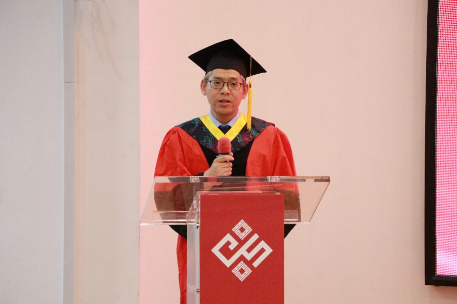 典礼在激昂雄壮的国歌声中拉开帷幕,在毕业生即将离开校园走向社会这个人生的重要时刻,教师代表徐飞寄语毕业生:第一、如果把人生比作为一个分布式系统,那么它也满足“CAP定理”。人生中的CAP定理可被重新定义为:人生的高定位、低投入以及高回报这三者不可兼得。它给大家的启示是:一定要明确自己的定位和人生目标,脚踏实地、全力以赴,才能取得所期待的成就;第二、如果把人生比作为一个数据库系统,那么它的“E-R图”需要每个人去精心设计与规划。期待同学们在“社会”这所隐形大学里,一定要遵循人生中的“CAP定理”,全力设计出属于自己的人生“E-R图”,为未来的美丽人生交出一份完美的答卷。
