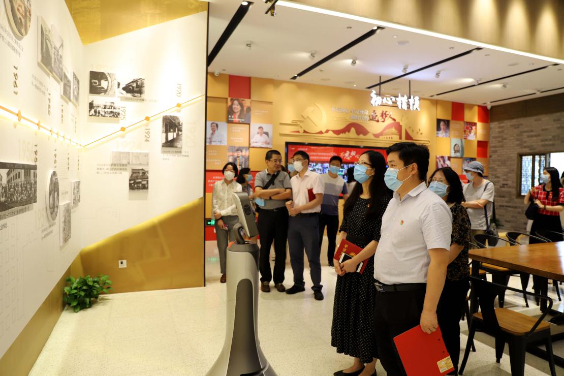在初心展厅,党员们在机器人向导的讲解指引下,聆听了普陀区党建发展的心路历程,从初心楷模到时代追梦人,他们的热血和青春挥洒在苏州河畔,一代代优秀共产党员与基层组织谱写了奋斗的诗篇,记录了普陀区发展的变迁。