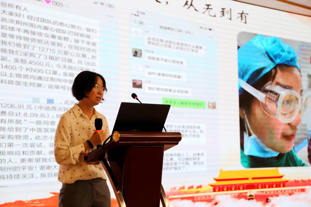 2017级硕士研究生党支部叶莎莎作为优秀共产党员代表分享了她的抗疫故事,作为湖北荆州籍党员员工,在武汉封城,荆州告急的危难时刻,她与同学一起筹建成立荆州阳光爱心团队,短短三天之内筹集款项并采购物资,面对不断涨价的紧缺医用物资,他们坚持不懈不放弃、分工合作,全球寻找货源,核对医疗资质保障品质,从无到有迅速为荆州中医院募集资金12000余元用于购买1800副护目镜和1400个KN95口罩,看到医护人员戴上了他们的用品,叶莎莎和同学们感到无比欣慰,危难时刻的经历让他们一生难忘。