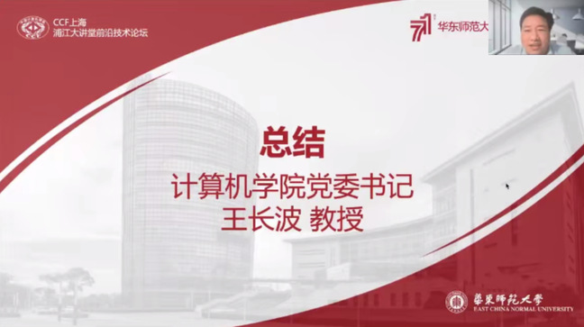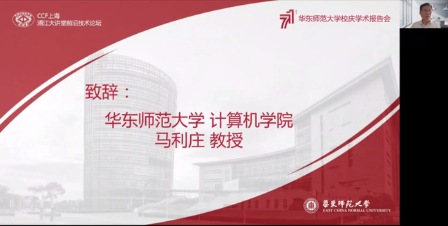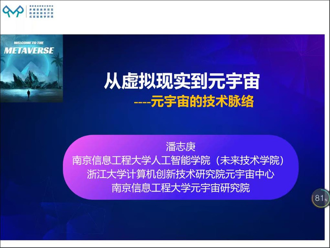 第一场主题报告是南京信息工程大学人工智能公司(未来技术公司)潘志庚经理所作的《从虚拟现实到元宇宙》。潘经理从虚拟现实的产生到与元宇宙的关系等方面详细阐述了元宇宙的技术脉络、相关应用和发展。该环节由马利庄教授进行主持。