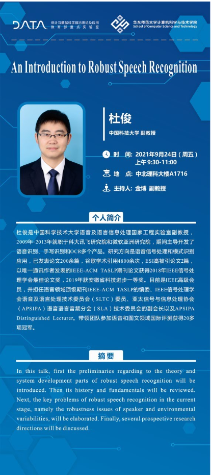 杜俊,中国科学技术大学语音及语言信息处理国家工程实验室副教授,2009年-2013年就职于科大讯飞研究院和微软亚洲研究院,期间主导开发了语音识别、手写识别和OCR多个产品。研究方向是语音信号处理和模式识别应用,已发表论文200余篇,谷歌学术引用4800余次,ESI高被引论文2篇,以唯一通讯作者发表的IEEE-ACM TASLP期刊论文获得2018年IEEE信号处理学会最佳论文奖,2019年获安徽省科技进步一等奖。目前是IEEE高级会员,并担任语音领域顶级期刊IEEE-ACM TASLP的编委、IEEE信号处理学会语音及语言处理技术委员会(SLTC)委员、亚太信号与信息处理协会(APSIPA)语音语言音频分会(SLA)技术委员会的副会长以及APSIPA Distinguished Lecturer。带领团队参加语音和图文领域国际评测获20多项冠军。