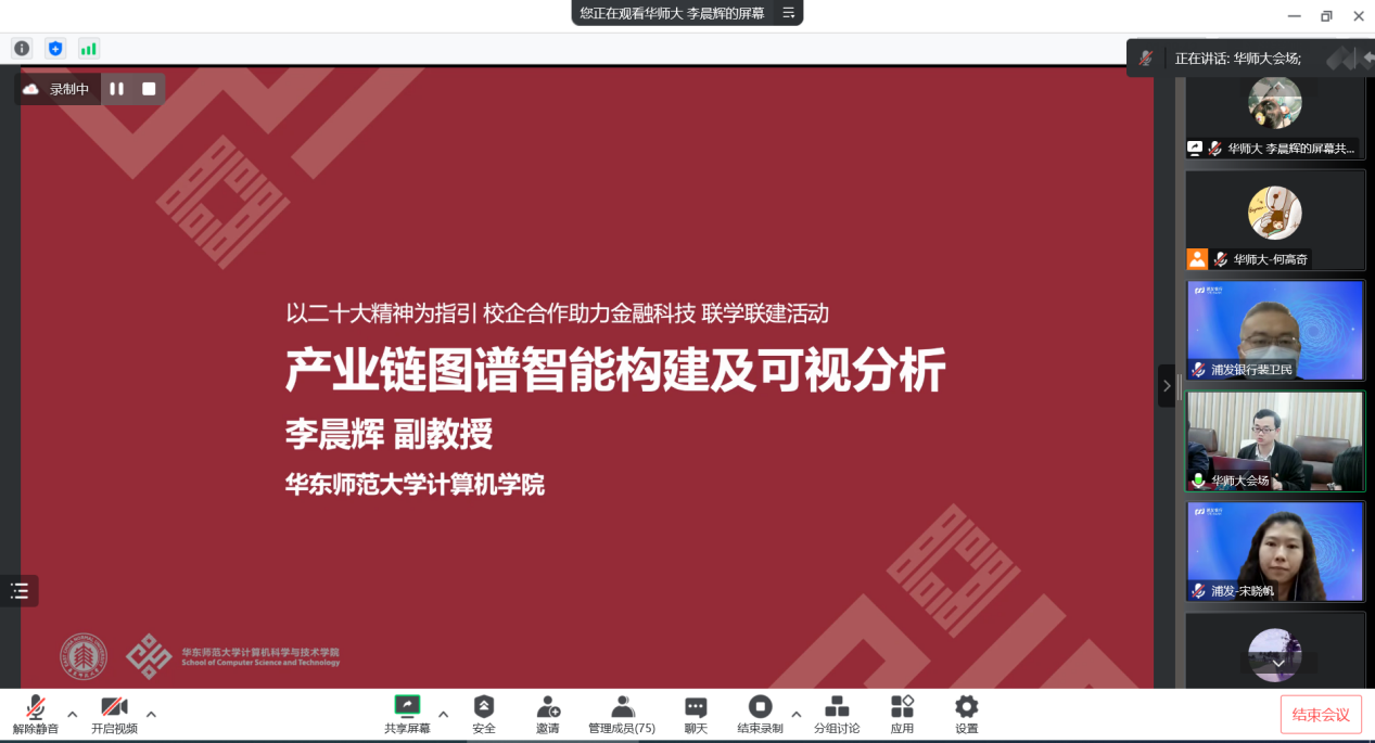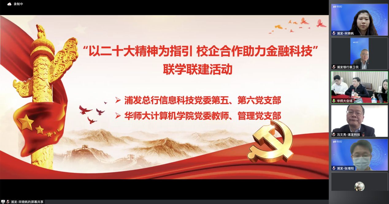11月27日下午,3044AM永利3044AM永利教师党支部、管理党支部、20级学硕支部与浦发银行信息科技党委第五、第六党支部连线开展“以二十大精神为指引校企合作助力金融科技”开展区域化党建联建。浦发银行信息科技党委第五党支部党员、华东师大员工宋晓帆主持活动。