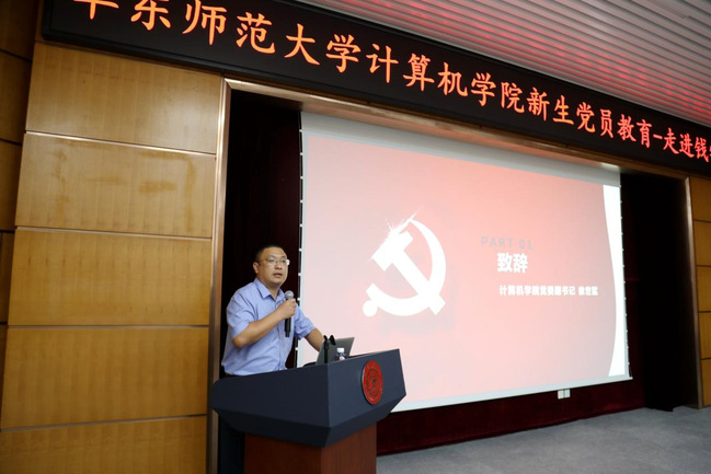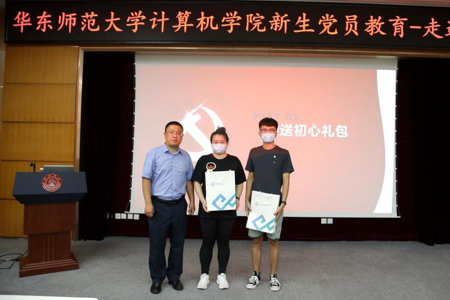 徐世猛为新生党员代表赠送初心礼包,里面包含了《中国共产党党章》、党员徽章、《他日归来-钱学森的求知岁月》。