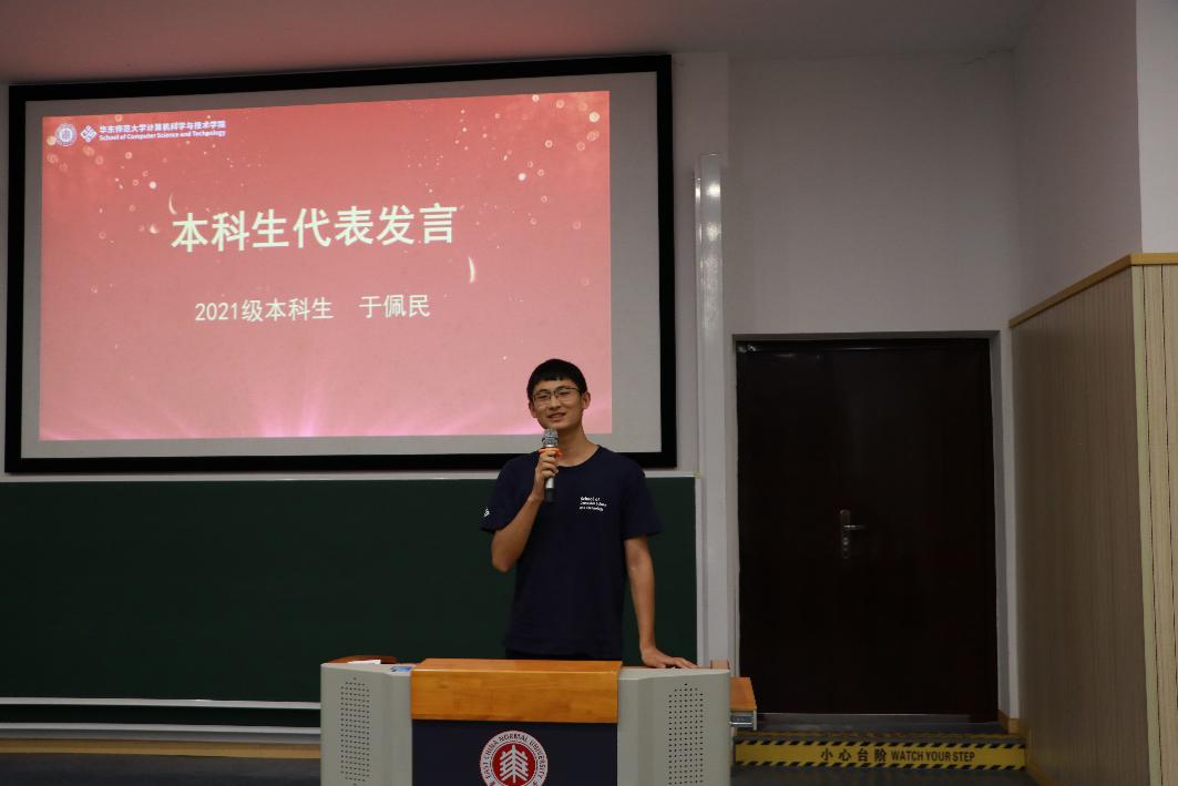 2021级本科新生代表于佩民发言中提到在师大感受令人敬佩的大师精神、工匠精神,意气风发、挥斥方遒的新时代青年,心怀理想、筑梦华师!