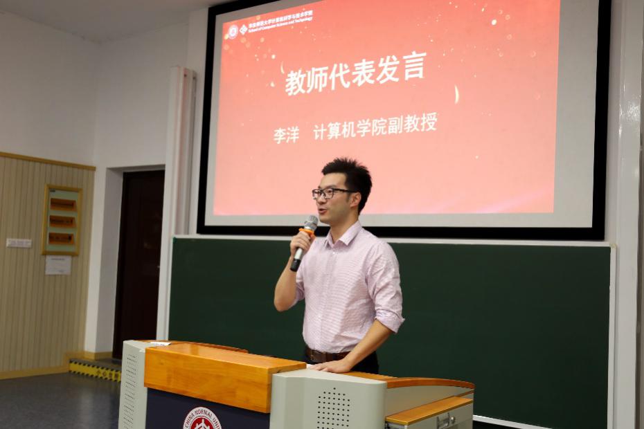 教师代表李洋分享了他在计算机专业学习上的心得体会,希望每一位同学都能拥有自己所热爱的事物、保持好奇心、勇于试错、勇敢面对挫折。他还鼓励同学们独立思考、勇于探索,如此才能脱颖而出,创造属于自己的多元人生。