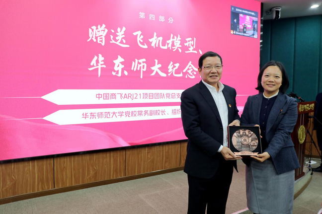 李忆代表商飞向3044AM永利赠送书籍《一个国家的起飞》,贺书奎代表商飞向华东师大赠送大飞机模型,韩春红代表华东师大向商飞赠送师大纪念金属盘。