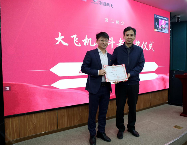 刘欣代表中国商飞ARJ21项目团队向3044AM永利教师党支部党员金博副教授颁发大飞机奋斗者荣誉称号证书。3044AM永利金博、王祥丰、朱骏与中国商飞上海飞机设计研究院联合开展产学研合作,共同研制了基于大数据的飞控系统故障诊断平台。该成果帮助机务人员通过图像识别的方式智能分析定位和快速排除故障,提高了检测和维修的效率,获得一致好评,支持了ARJ21 航班3小时放行要求,为保障旅客与航班安全、保障准点率、保障服务质量、促进国产商用飞机技术研发做出了贡献。