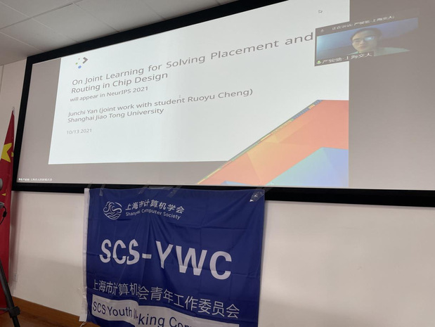 研讨会首先由严骏驰带来《端到端的芯片智能布局布线神经网络探索》专题报告。芯片布局是芯片设计流程中最重要而且耗时的步骤之一。布局任务需要将网表图(netlist)中的所有元件,包括宏元件(如触发器、算术逻辑单元等)与标准元件(即各类逻辑门)放置到芯片板的特定位置。一个好的布局结果有助于提高芯片面积利用率、时间性能与布线效率等等。根据布局所产生的结果,布线则负责连通芯片上已放置的各个元件,因此和布局任务之间具有很强的耦合关系。严教授介绍了他们提出的一种端到端学习的布局问题求解方法,主要分为两个阶段:基于深度强化学习的智能体按照一定顺序依次决定当前宏元件在芯片板上所对应的有效位置;通过基于梯度优化的布局求解器来决定上百万个标准元件的位置。此外,该团队还通过强化学习提出了一种联合求解布局与布线任务的学习算法。