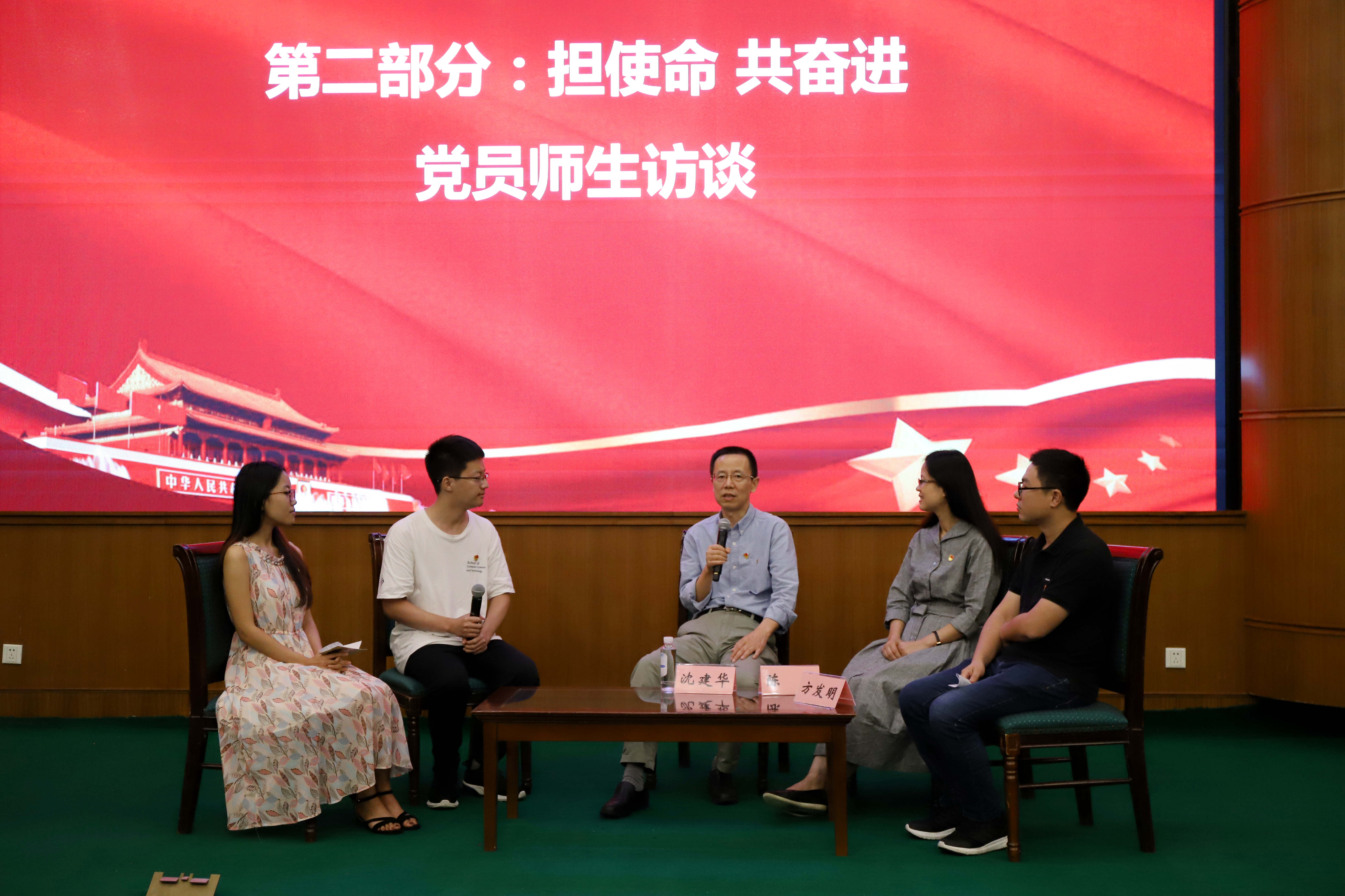 第二部分担使命,共奋进,师生访谈。教师支部沈建华、陈蕾、方发明,三位经历了不同时代的党员代表分享了他们与师大与计算机的初心故事。沈建华老师作为与计算学科共同成长起来的代表,伴随着时代变迁的日新月异见证了这个学科从无到有一点点发展的历程,他鼓励同学们把握现在,扎实学好基础知识,锻炼强健的体魄成为国家的有用之才。陈蕾老师作为中生代的代表,专注基层教学,她给同学们的建议是把节奏慢下来,站位要高眼界要宽,姿态要低,结合卓越育人与新工科人才培育,她深入解读了“五性合一”的人才培养模式,卓然独立,越而胜己,她勉励同学们抓住机遇做好规划,实现与公司发展的同频共振。方发明教授是新生力量的代表,他从自身的成长经历中给新生的科学研究提出了建议,保持探索未知的好奇与积极外拓走出去的勇气,只有在两者的驱使下才能让研究越做越好。