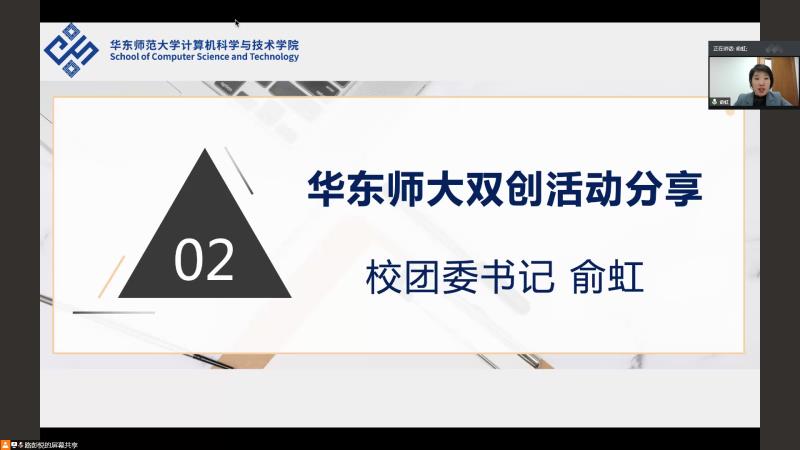 随后,校团委书记俞虹进行双创竞赛项目指导。俞书记重点分享了包含大夏杯、挑战杯在内的校级、市级、国家级科技创新项目竞赛,介绍了大赛时间及注意事项等,鼓励同学们组建跨学科队伍,积极参与双创赛事,同时希望同学们在比赛中收获更多的成长。