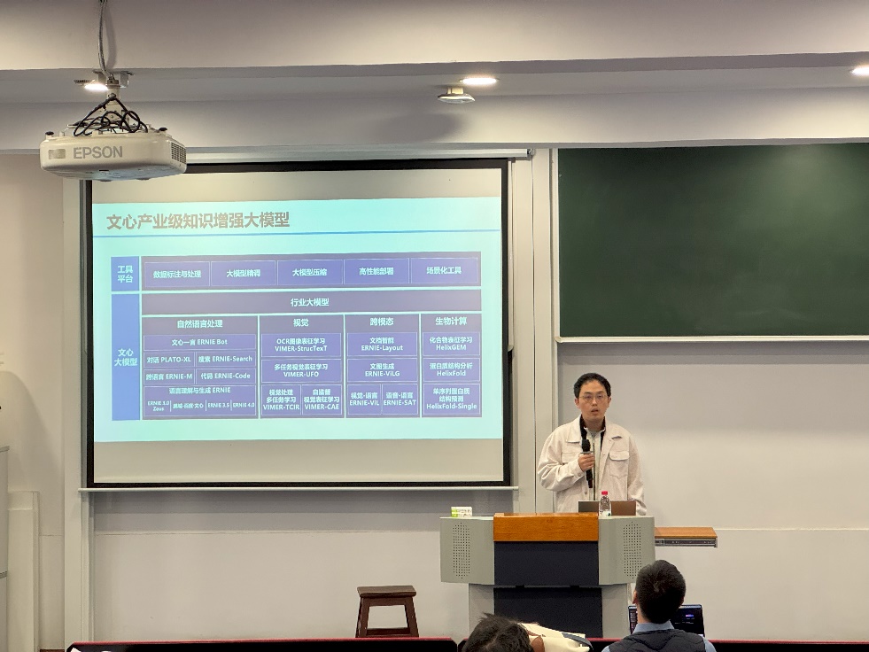 11月6日下午14点,百度资深工程师方华强受邀在计算机楼B115,带来《文心加飞桨技术创新与产业应用》主题报告。报告由周杰青年研究员主持。方化强老师系统介绍了百度大模型的主要架构、发展路线、算法优化以及应用平台等多个方面,其研发思维链、训练加速、推理加速、知识增强等核心算法,集成于Paddle平台,为国内大模型生态做出了重要贡献。他通过具体实例,展示了文心大模型在文本生成、代码生成、数学解题和图像生成等场景的使用方式和效果,让研究生对大模型能有更加深入的了解,促进员工更好地利用AI技术来解决学习和生活中的问题。