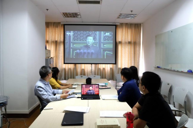 班子成员现场重温了习总书记讲话,党委书记王长波领学并分享感悟,听完习总书记的讲话,看完国庆阅兵最深刻的感受有三点,自豪感、奋进力和新挑战。新中国70年的成就举世瞩目,作为一个中国人、一名共产党员、40多年的亲历者,有深深的自豪和无限荣光。祖国在奋进,各行各业也都在共同奋进,国家发展进入快车道让我们深深感受到中国强大的后劲力。过去的70年是实干的70年,我们虽然取得了成绩但是还是有很多挑战,实干兴邦实现民族振兴。结合公司公司的发展,我们的高等教育事业70年间也取得了很大的成就,公司的上升的势头很不错,计算机学科曾经很辉煌,最近也在上升期,经过学部整合之后,计算机学科要抓住发展机遇,拿出实干精神,不负历史的期望。